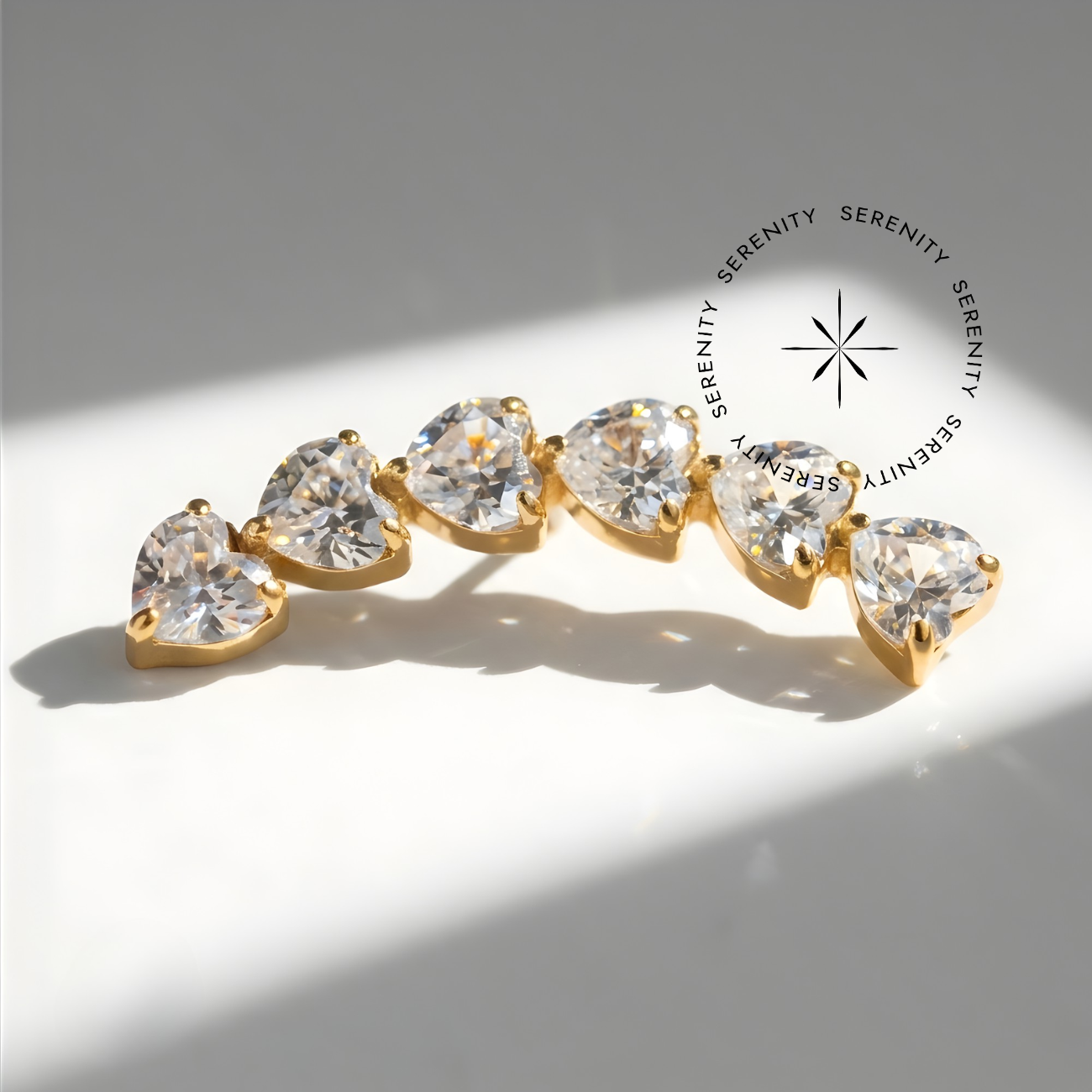 O Topo Cluster de Corações (TN1760) é uma ode à sofisticação e ao detalhismo. Composto por seis zircônias premium em lapidação de coração meticulosamente alinhadas em um arco suave, esta joia oferece um efeito de “ear crawler” espetacular. Com expressivos 15.5 mm de extensão, ela foi projetada para abraçar a anatomia auricular, transformando a cartilagem em um rastro de brilho e delicadeza. É a escolha definitiva para quem busca uma peça statement que une a autoridade do titânio dourado a uma estética apaixonante.