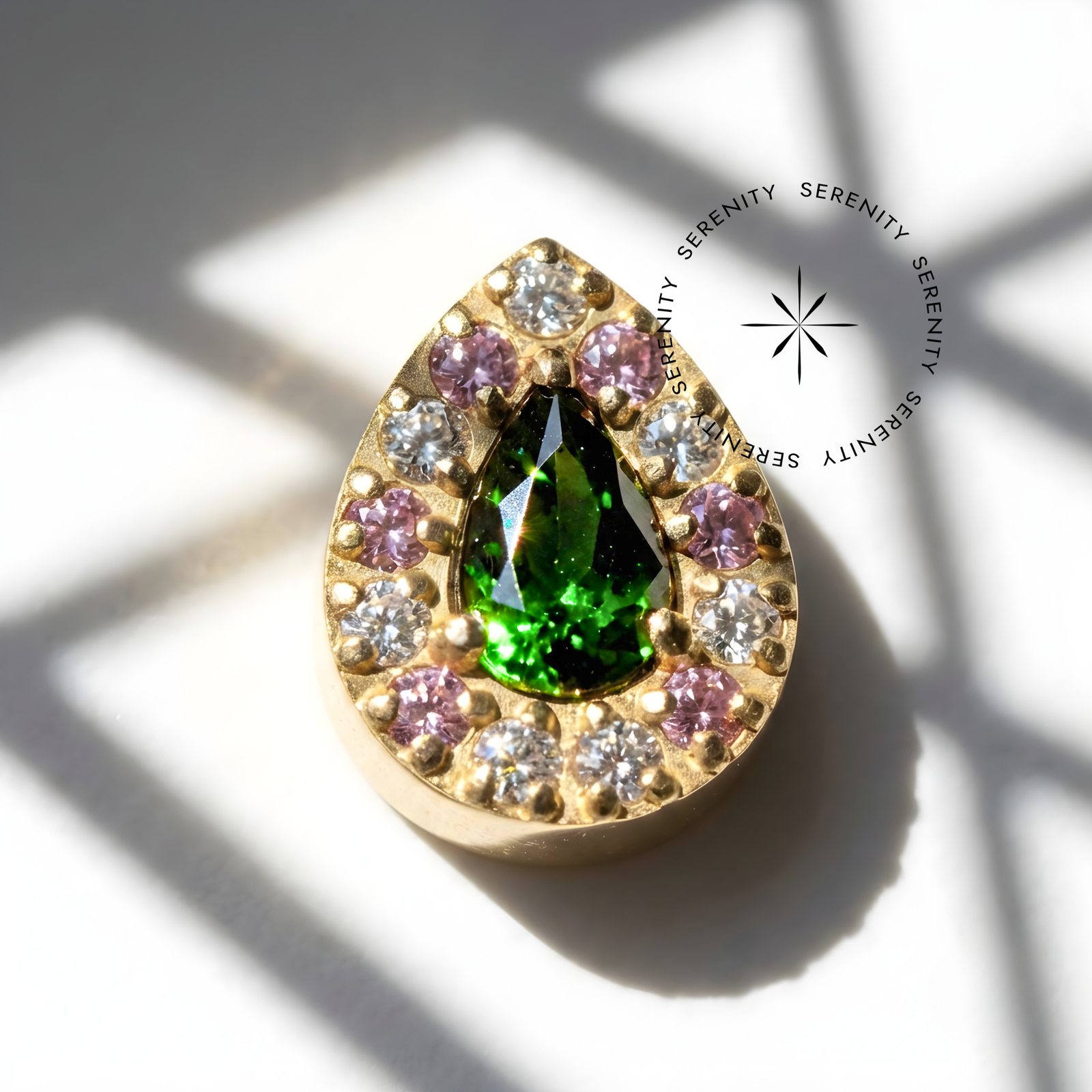 Piercing Topo Gota Zircônia Verde e Rosa Titânio e Ouro 18k
