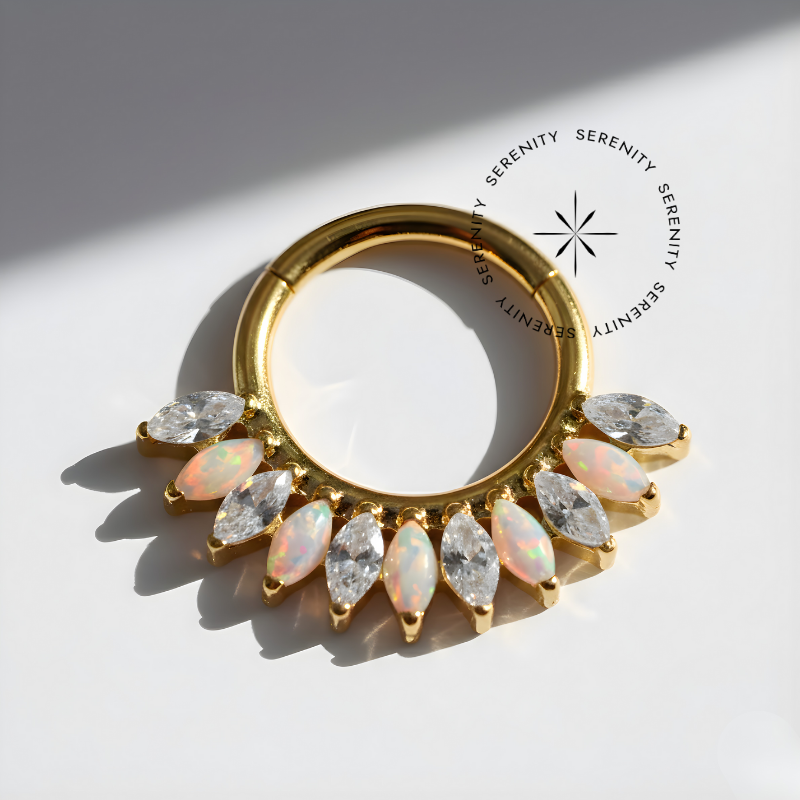 Descrição: Ideal para cartilagem, lóbulo, helix,septo, daith, entre outros piercings, oferecendo um ajuste confortável e seguro. É uma joia cheia de estilo.
