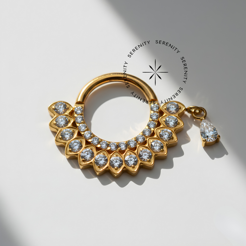 Descrição: Ideal para cartilagem, lóbulo, helix,septo, daith, entre outros piercings, oferecendo um ajuste confortável e seguro. É uma joia cheia de estilo.