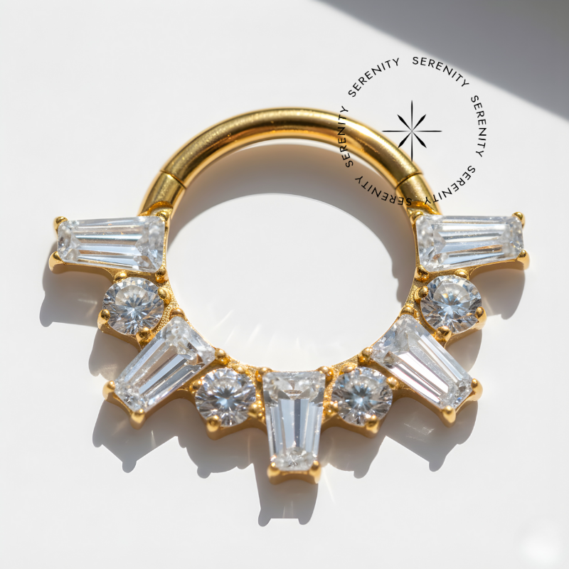 Descrição: Ideal para septo, daith, cartilagem, lóbulo, helix, entre outros piercings, oferecendo um ajuste confortável e seguro. É uma joia cheia de estilo.