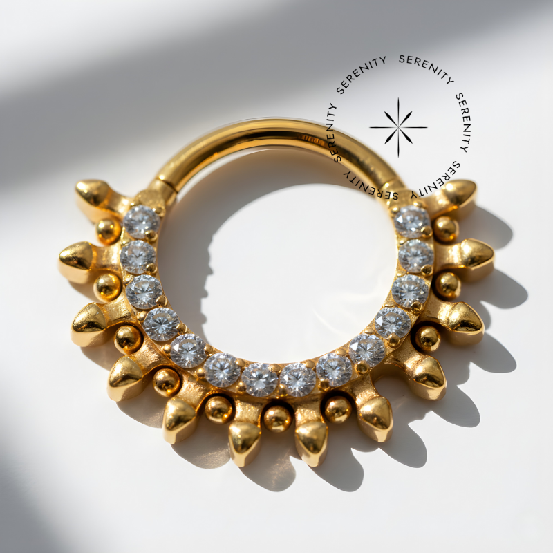 Descrição: Ideal para septo, daith, cartilagem, lóbulo, helix, entre outros piercings, oferecendo um ajuste confortável e seguro. É uma joia cheia de estilo.