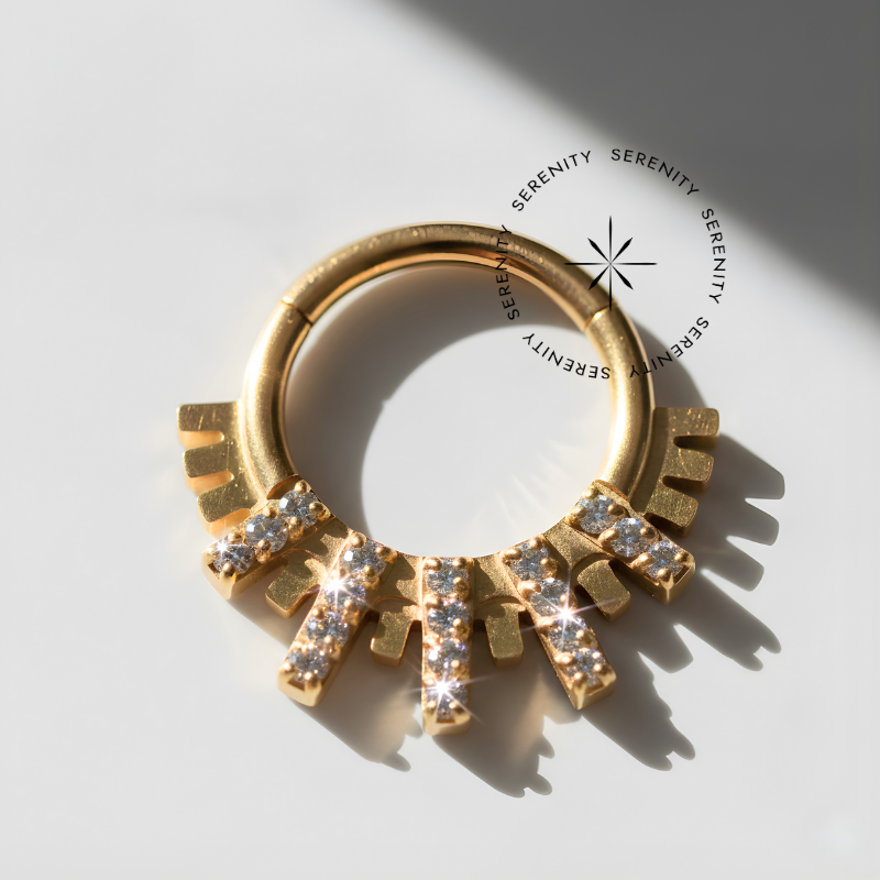 Descrição: Ideal para septo, daith, cartilagem, lóbulo, helix, entre outros piercings, oferecendo um ajuste confortável e seguro. É uma joia cheia de estilo.