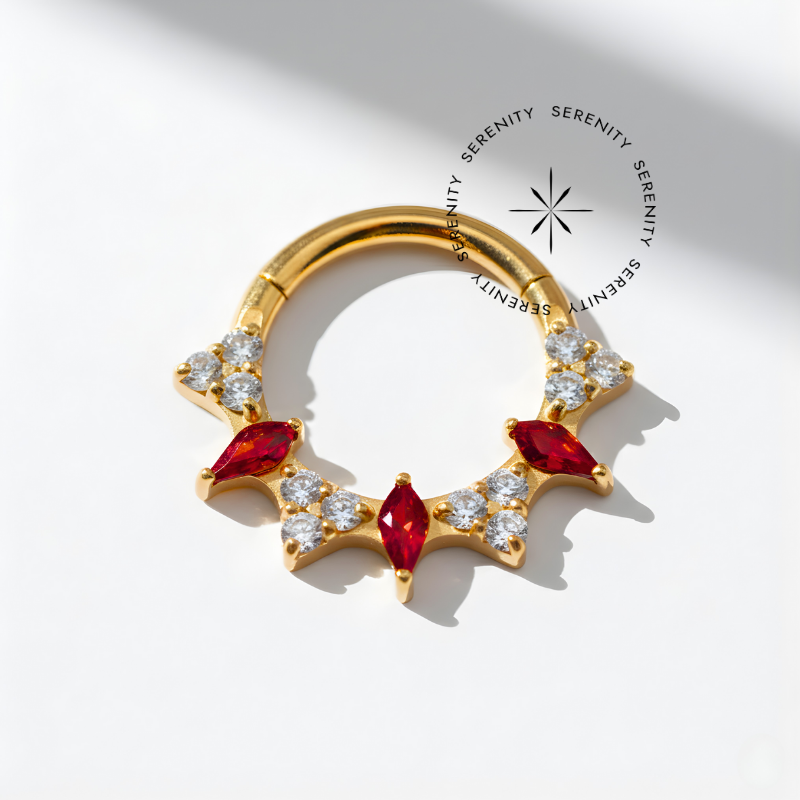 Descrição: Ideal para cartilagem, daith, septo, entre outros piercings, oferecendo um ajuste confortável e seguro. É uma joia cheia de estilo.