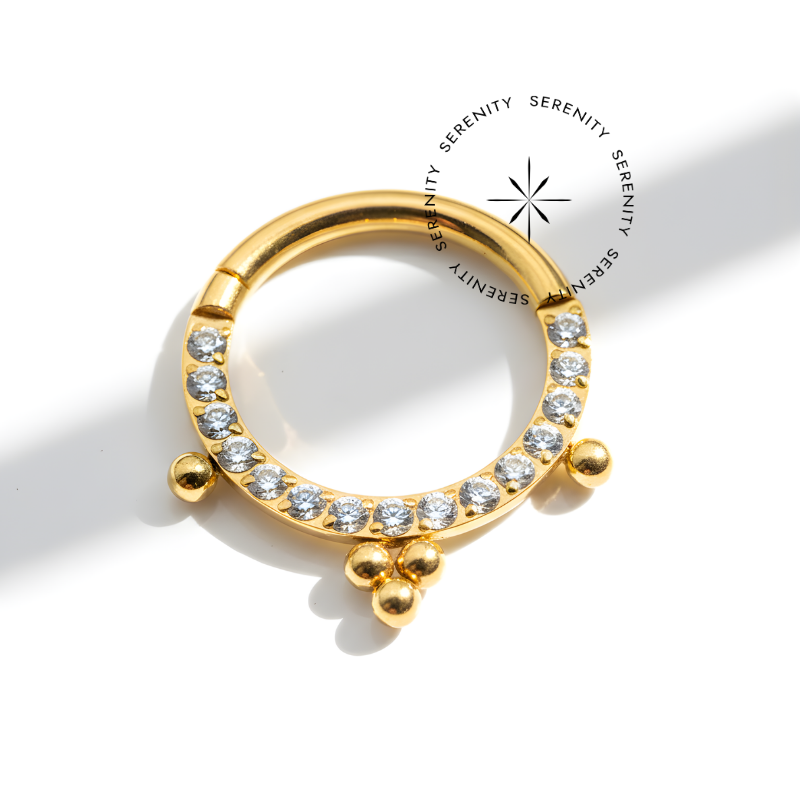 Descrição: Ideal para cartilagem, lóbulo, helix,septo, daith, entre outros piercings, oferecendo um ajuste confortável e seguro. É uma joia cheia de estilo.