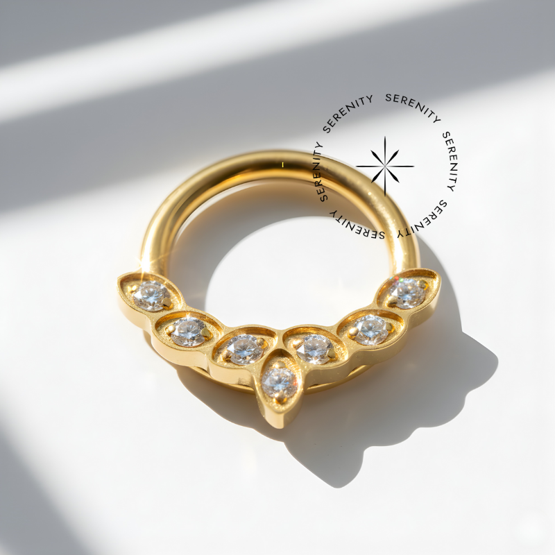 Descrição: Ideal para cartilagem, lóbulo, helix,septo, daith, entre outros piercings, oferecendo um ajuste confortável e seguro. É uma joia cheia de estilo.